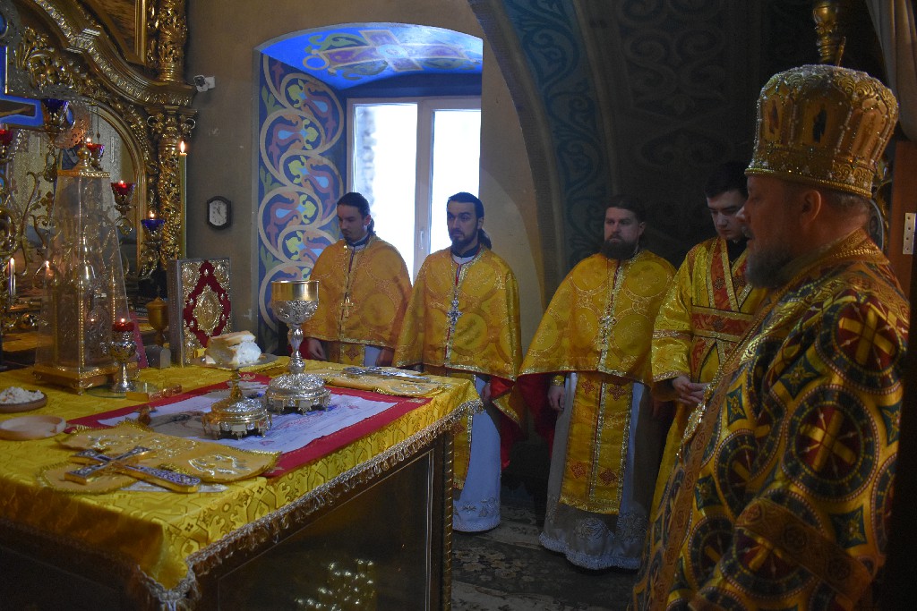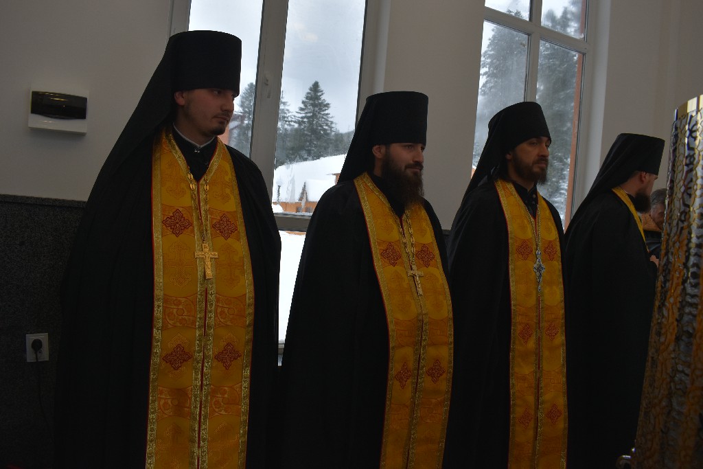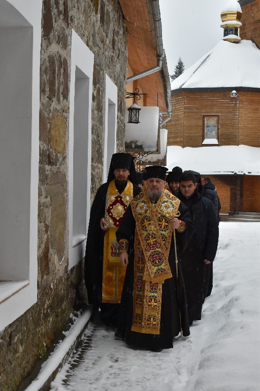 Його Високопреосвященству співслужив благочинний Манявської обителі архимандрит Герасим, чернече духовенство у священичому сані та протодиякон Димитрій Луцак. Після часу Трисвятого, читання Апостола звершив студент IV-го курсу Івано-Франківського Богословського Інституту ім. прп. Феодосія Манявського, Писарчук Олексій.Проповідь перед причастям вірних, з благословення настоятеля монастиря митрополита Іоасафа, виголосив архимандрит Софроній.