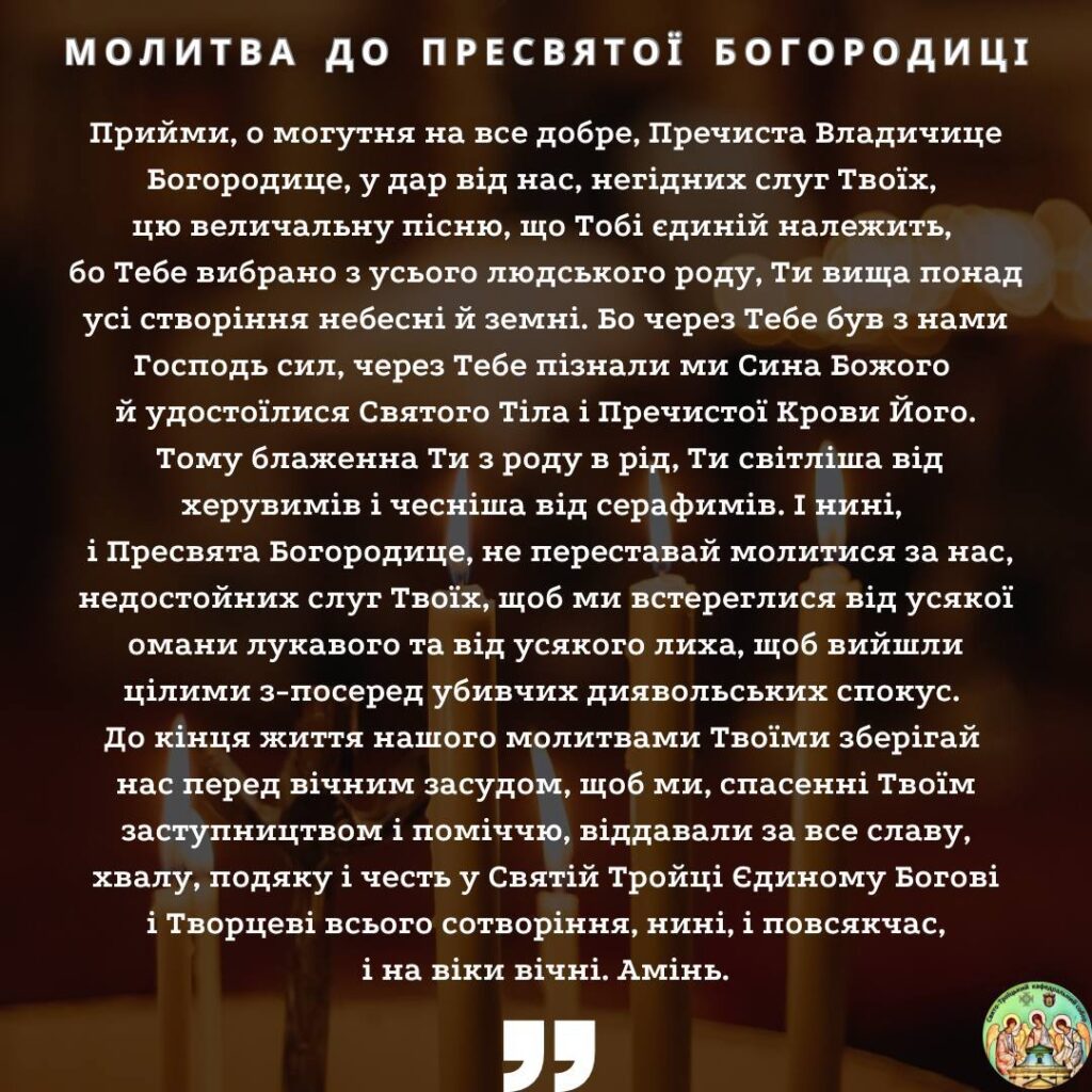 Ми шануємо Пресвяту Богородицю не тільки тому, що Вона стала Матір’ю Спасителя, але й тому, що Вона показала шлях істинної віри — глибокої, не показної, але непохитної. У цьому Її велич та Її близькість до кожної людини. Вона є прикладом чистоти серця, покори та любові, яка не шукає свого, але віддає себе повністю. Саме тому ми звертаємося до Неї в молитвах, довіряємо Їй свої радості й скорботи, відчуваючи Її материнське заступництво та підтримку.