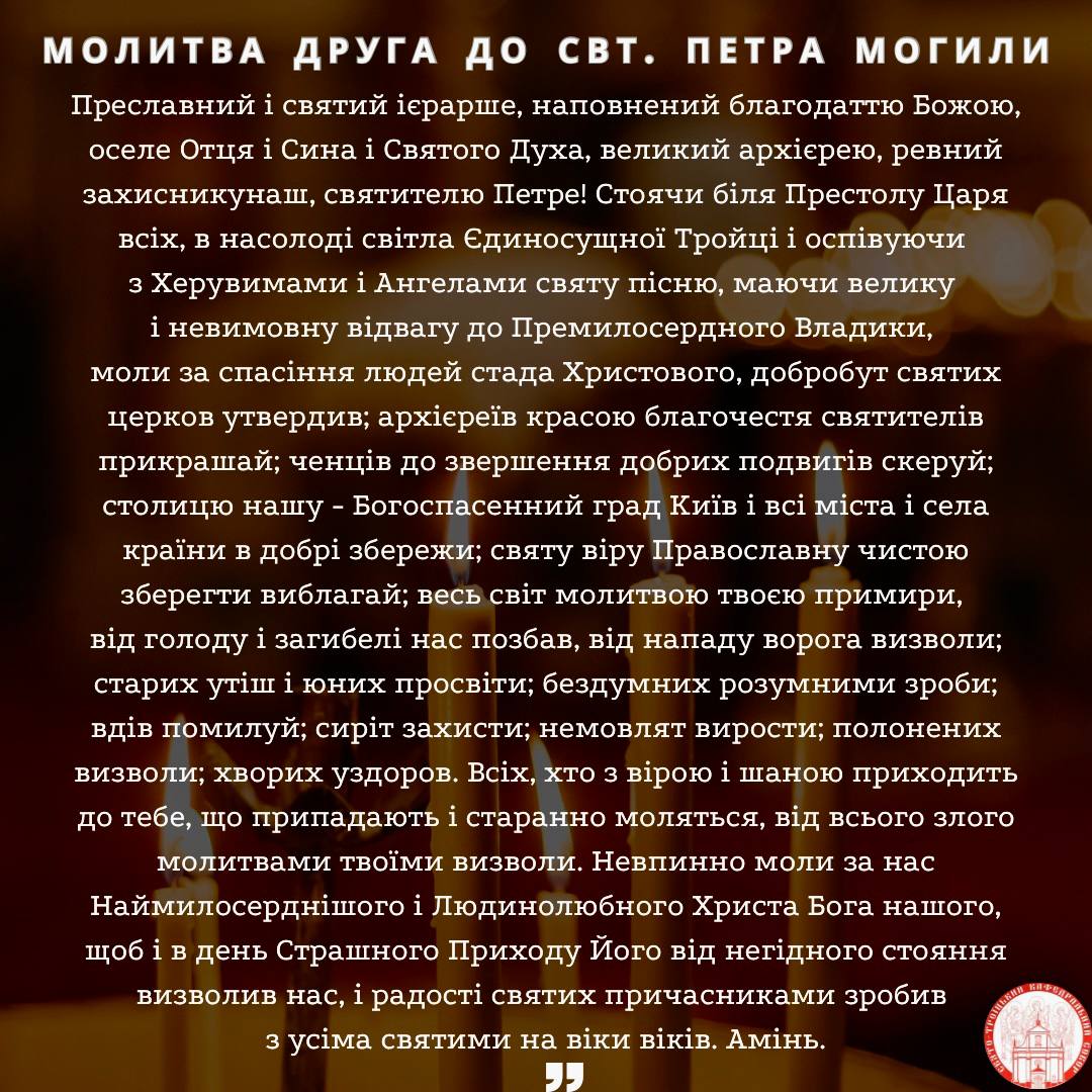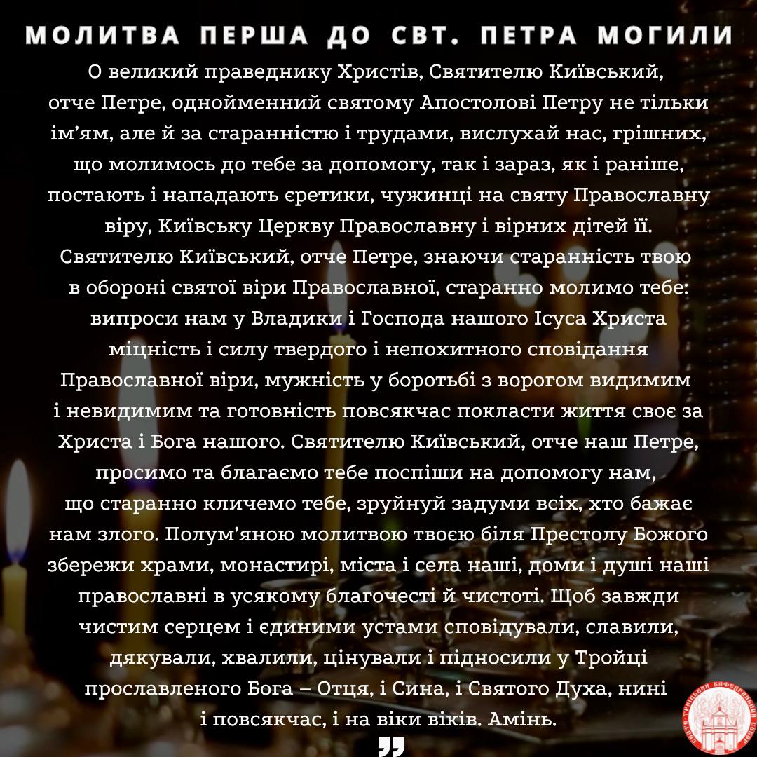 Також сьогодні Церква вшановує святителя Петра Могилу, митрополита Київського і Галицького, та всієї Руси, сина молдавського володаря Симеона Могили, який був однією з найвизначніших постатей в історії православної Церкви в Україні.