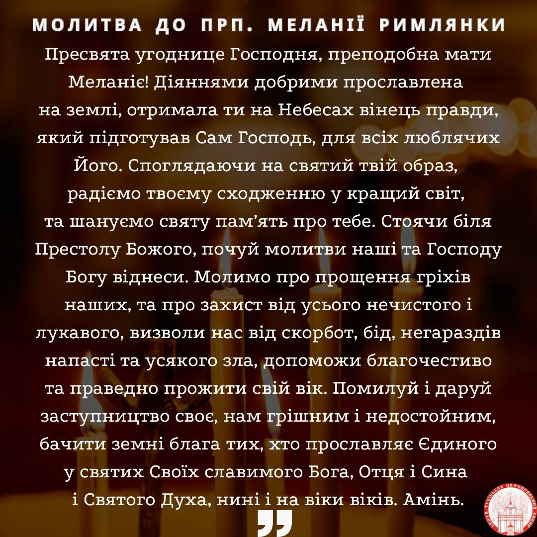 Сьогодні ж Церква вшановує преподобну Меланію Римлянку, яка народилася в Римі в знатній християнській сім’ї. У чотирнадцять років вона проти своєї волі була видана заміж за знатного юнака Апініана. Від самого початку спільного життя свята благала чоловіка жити з нею в непорочності або відпустити незаплямованою і тілом, і душею. Апініан відповідав: «Коли за велінням Господа ми матимемо двох дітей як спадкоємців свого майна, тоді разом зречемося світу».